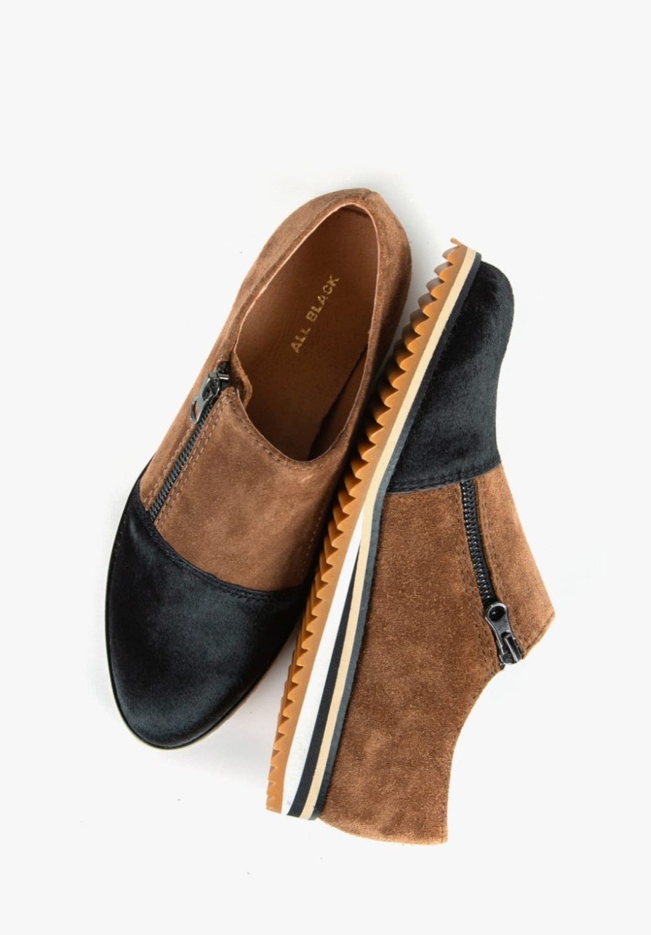 This chic suede & fur loafer is a must add to your wardrobe! She features a side zipper and sleek black fur cap toe.