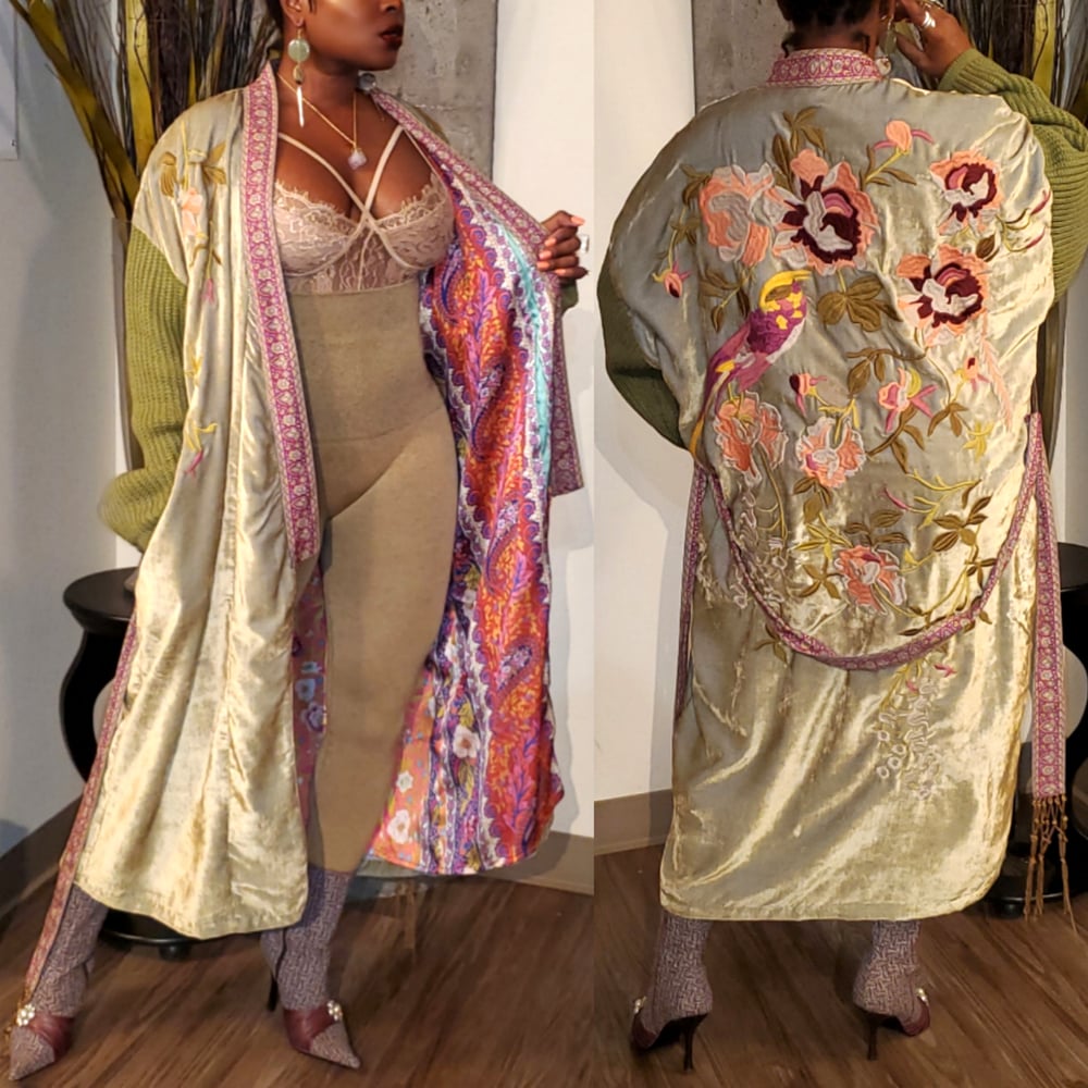 This Aratta Velvet Coat is nothing short of Amazing! The embroidered details, contrasting knit sleeves and layered patterns are a show stopper! She also features pockets and a fabric wrap belt with fringe detail!