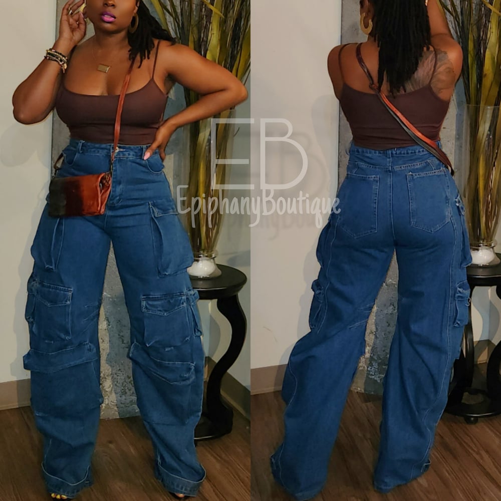 These chic, oversized cargo jeans are a MUST HAVE! She features a high waist with multiple, oversized cargo pockets.