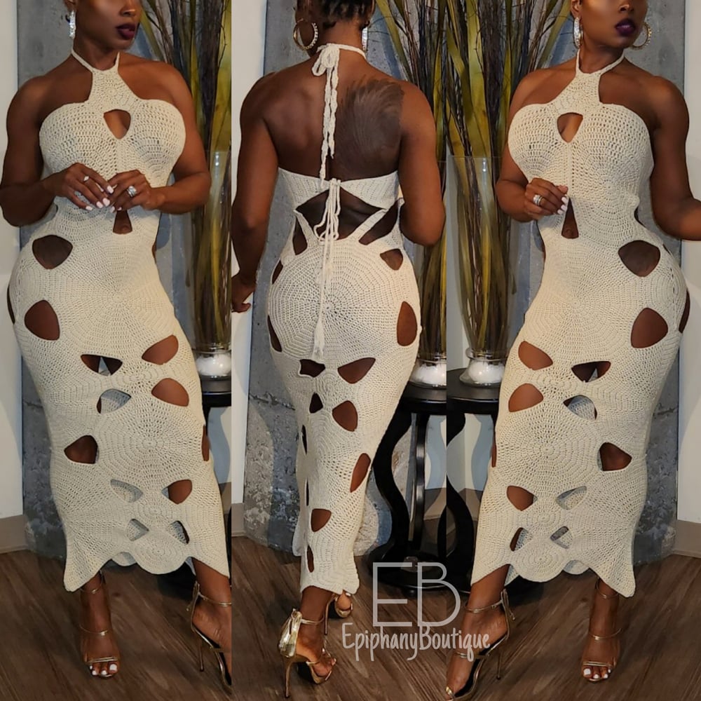 This Beautiful oatmeal color, crochet knit dress is EVERYTHING! She's a midi length with open holes throughout and features halter and back tie closure!