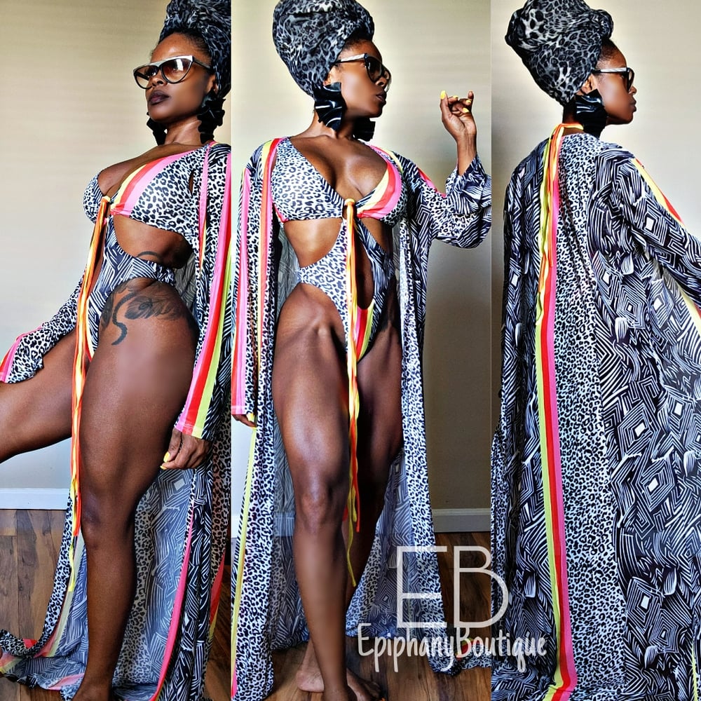 Set includes sexy one piece swimsuit and chic long sleeve duster/cover-up. This set is PERFECT to tag along on your next luxury vaca!