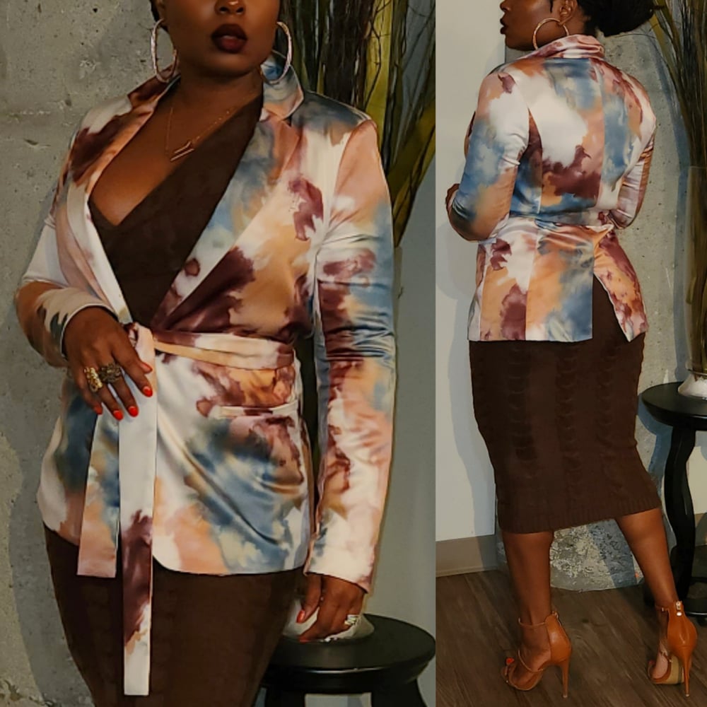 This chic, multi-color blazer features a beautiful "watercolor" affect pattern! With hues of brown, cream, and blue...she is Perfect for the season!