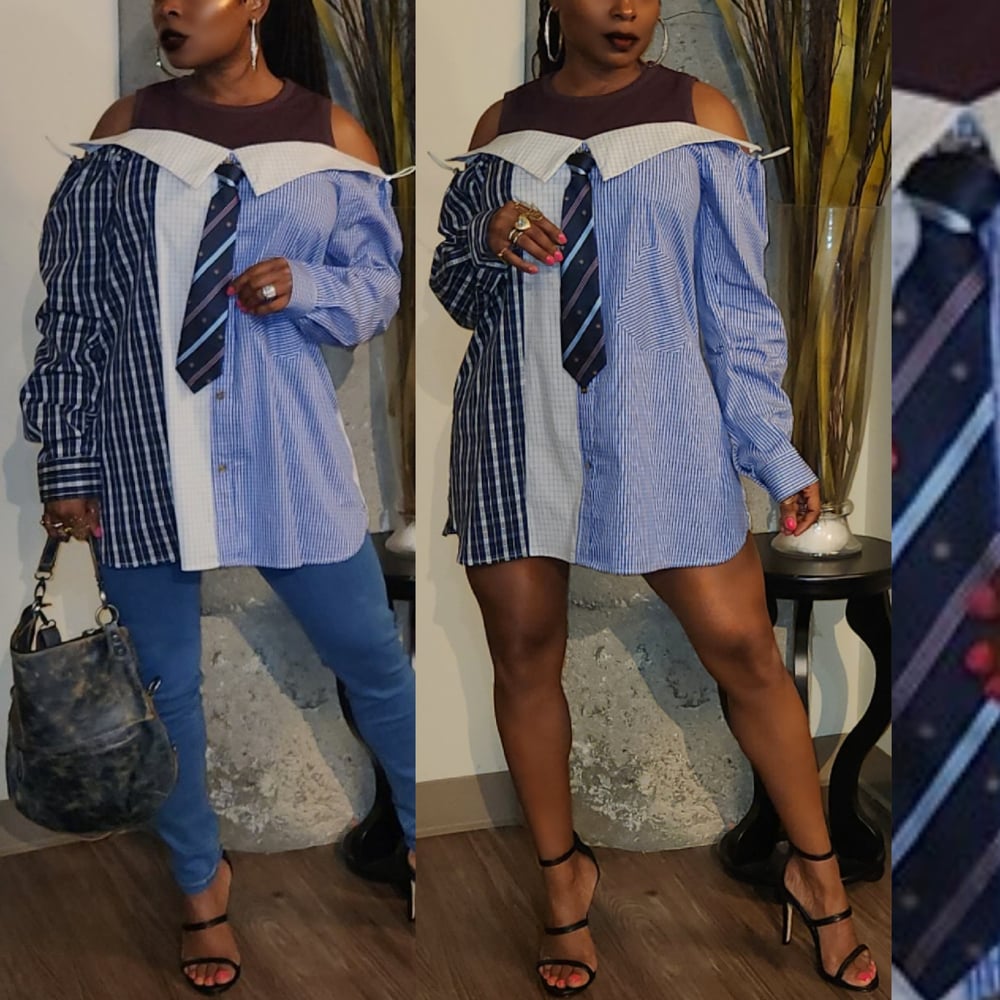 This chic, multi-layer, multi-print top features an off-shoulder design with " under tank" and "button up" over top with tie and pockets!