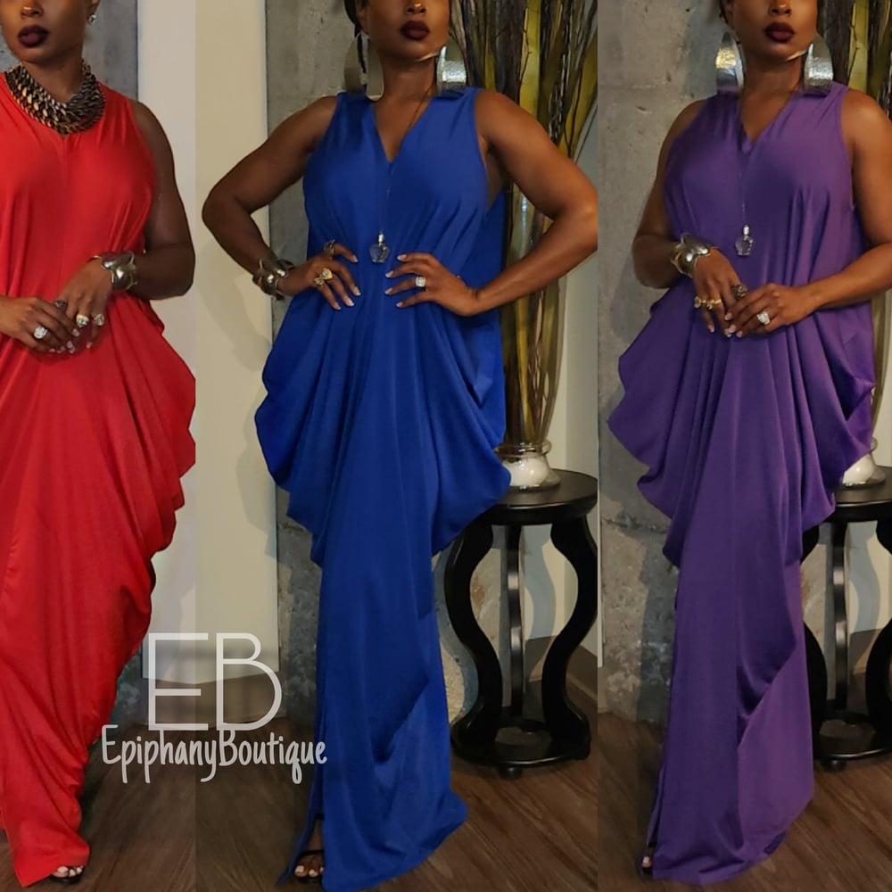 This dress is perfect for any event! She's sleeveless with an oversized, loose fit and features chic side ruching , v cut neckline, and short center split!
