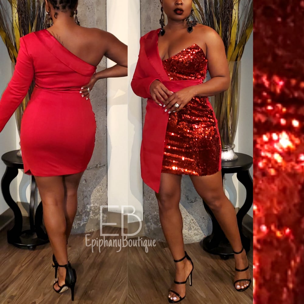 This one sleeve, sequin contrasting dress features a satin waist band and lapel.