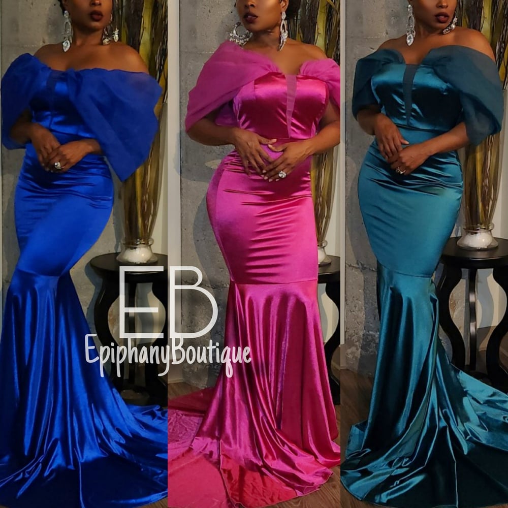 This GORGEOUS satin gown is a sleek mermaid fit with a chic off shoulder design and cascading train!