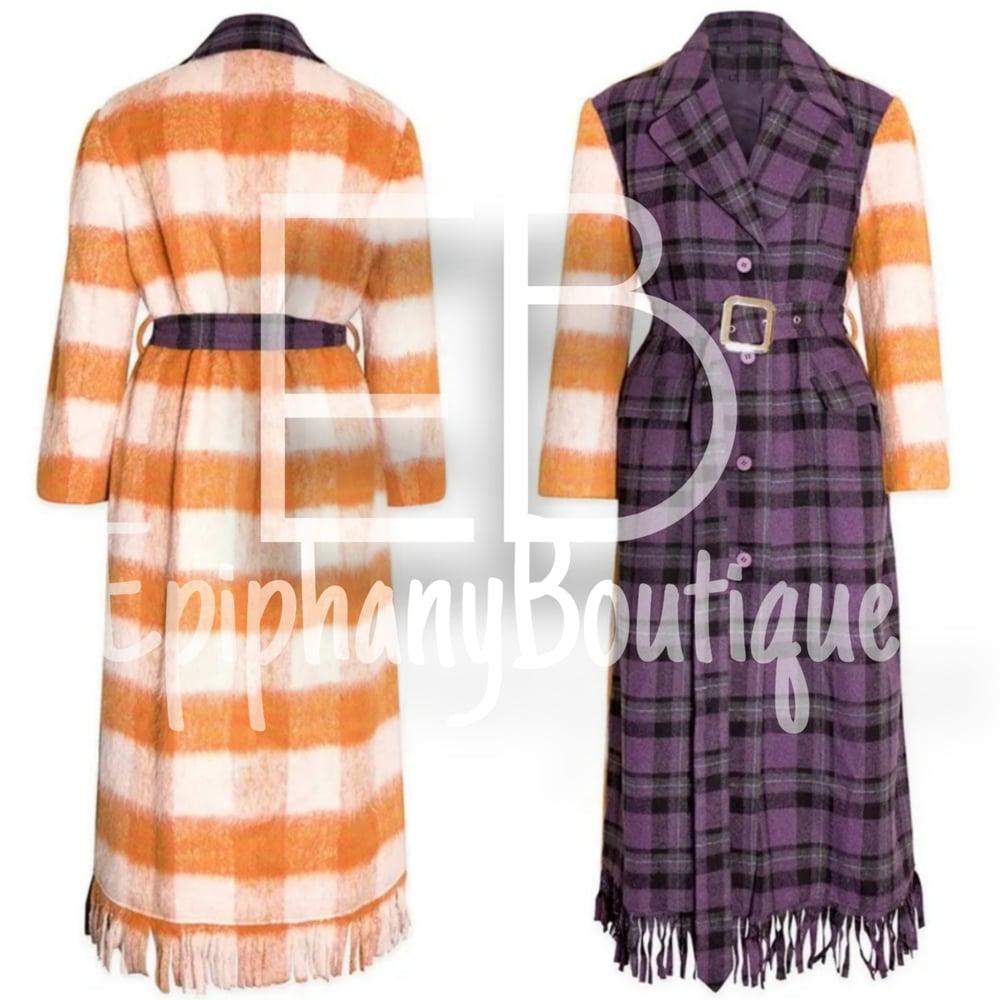 This multi-plaid print, wool trech coat is a Fashionista's dream! She features contrasting print front & back with fringed hem detail!