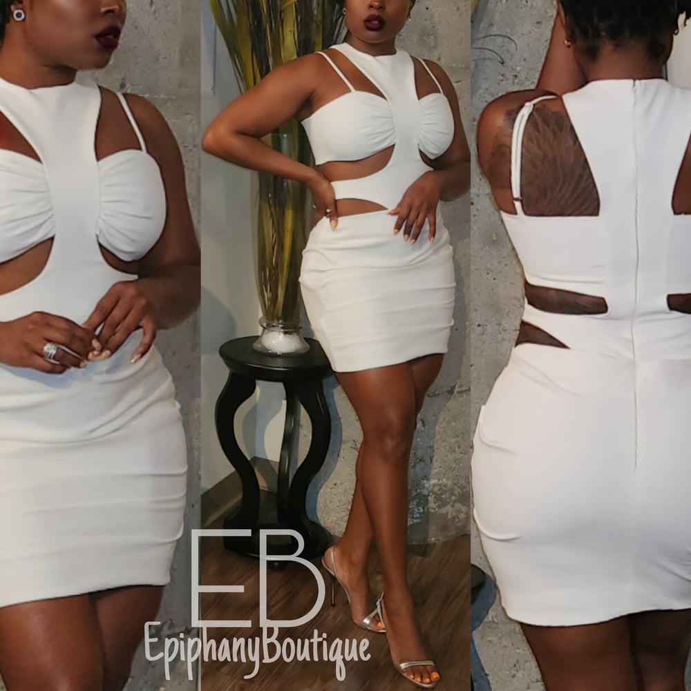 This sleek, white mini dress features sexy cut outs and ruching detail! She highlights the legs and accentuate the shoulders...shes the perfect "Little White Dress"!