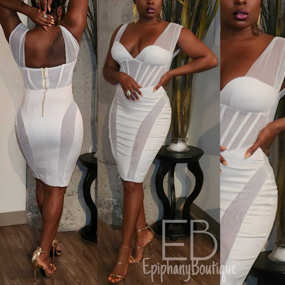 This chic, white satin dress features a sexy corset and mesh panel details! She is PERFECT for your next white event or just because, you are sure to make a statement in her!