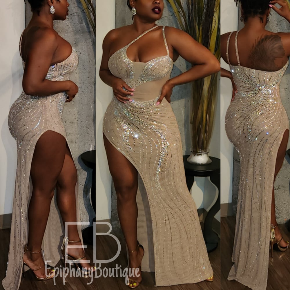 This beautiful, sleek gown is a warm nude color with iridescent & silver crystal throughout! She features a sexy one (1) shoulder design with a two (2) strap feature and sexy thigh high side split!